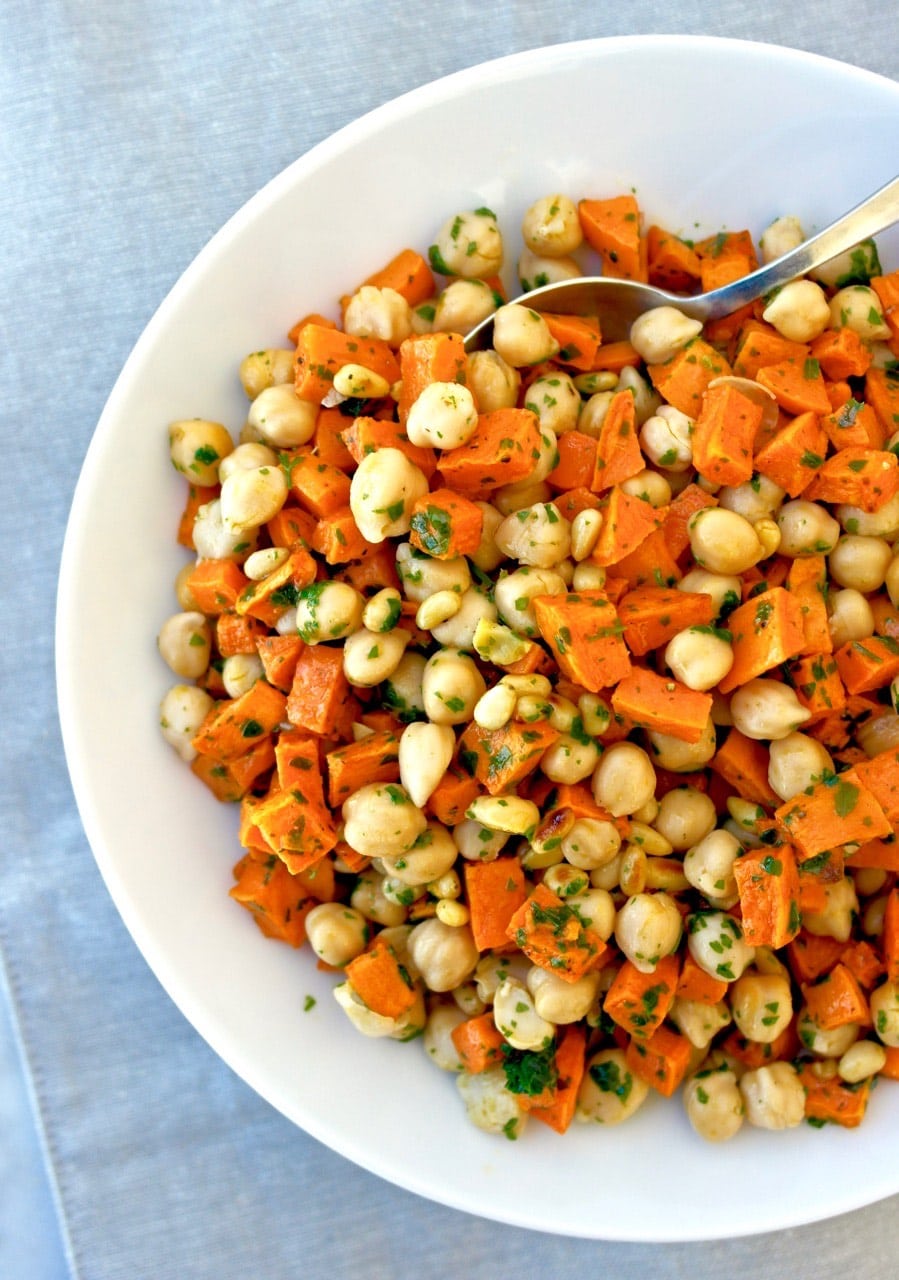 - In a serving bowl mix gently the chickpeas with sweet potatoes, pine nuts, parsley and the dressing. Sprinkle with salt and pepper before serving.