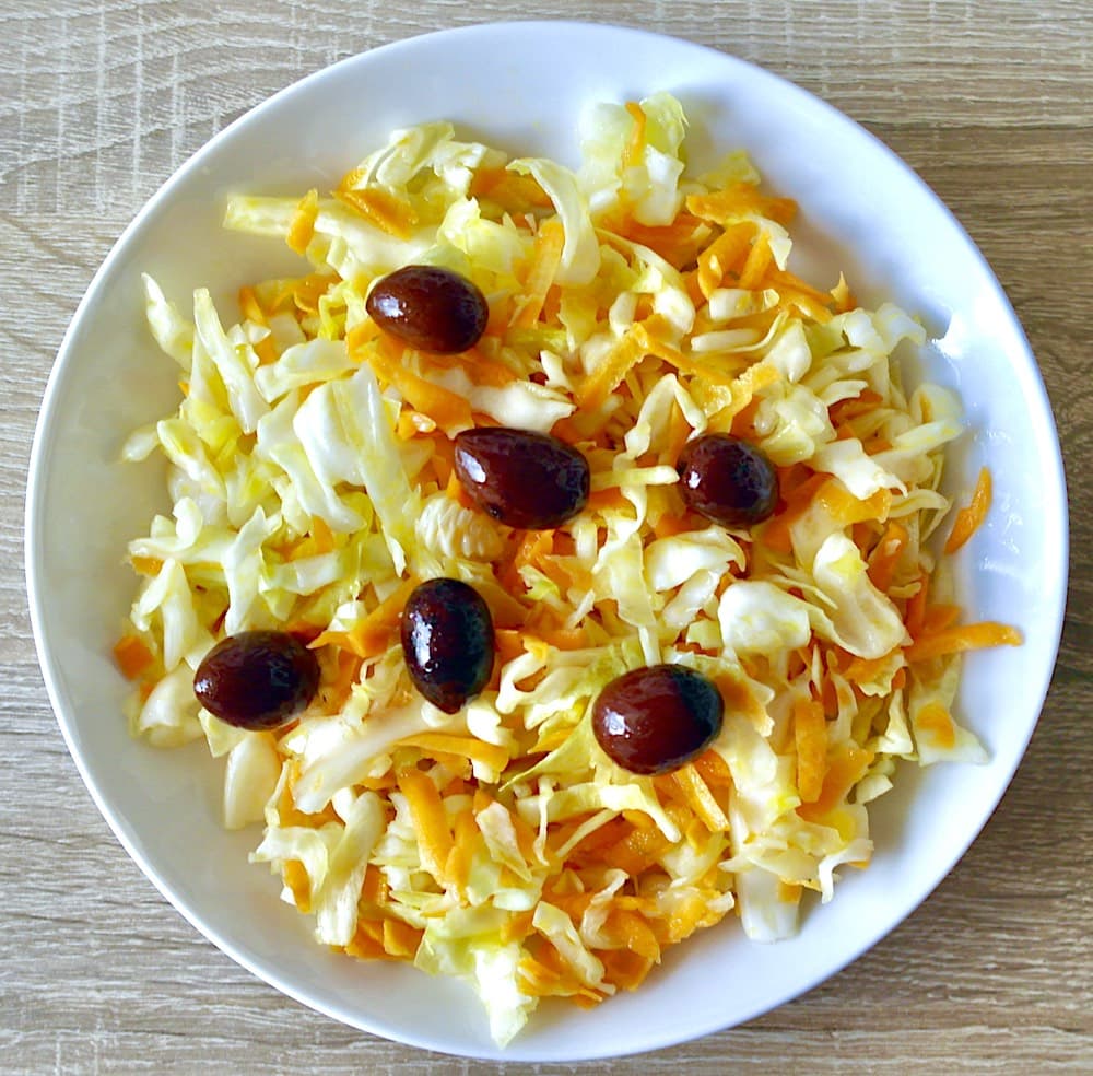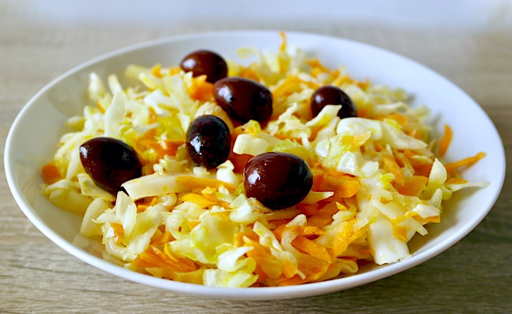 This salad obviously has a high nutritional value. The cabbage belongs to the cruciferous family, these vegetables are rich in phytochemicals, compounds that are produced by plants. They are associated with a reduced risk of cancer by stopping the growth of tumors. It also seems that these substances detoxify carcinogens before they cause any damage. They are also associated with reduced risk of cardiovascular disease. Carrots are are also rich in the phytochemical beta-carotene. With the addition of antioxidant rich olive oil and lemon juice which is a great source of vitamin C which is also an antioxidant, you have one of the healthiest salads around.