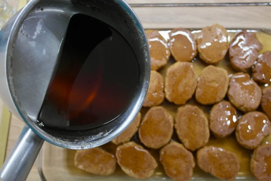 Once the syrup is boiled, while it is hot, pour it over the cookies, making sure all cookies are covered with syrup. Let the cookies sit for at least 2-3 hours with the top side facing down so that they absorb the syrup.