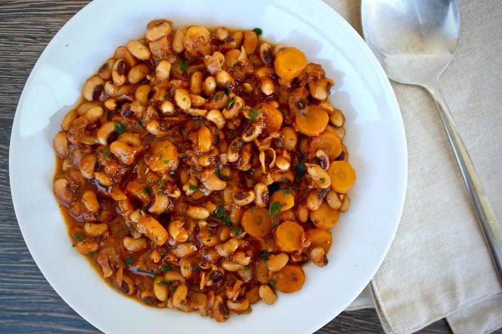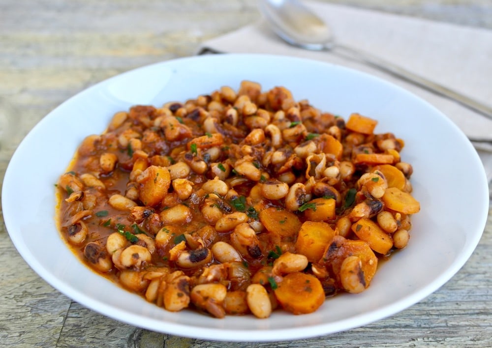 This is the classic way black eyed peas are prepared in Greece: stewed with onion, tomato and herbs until thick. This One Pot Greek Black Eyed Pea dish is hearty and good. It is often combined with spinach or other greens.