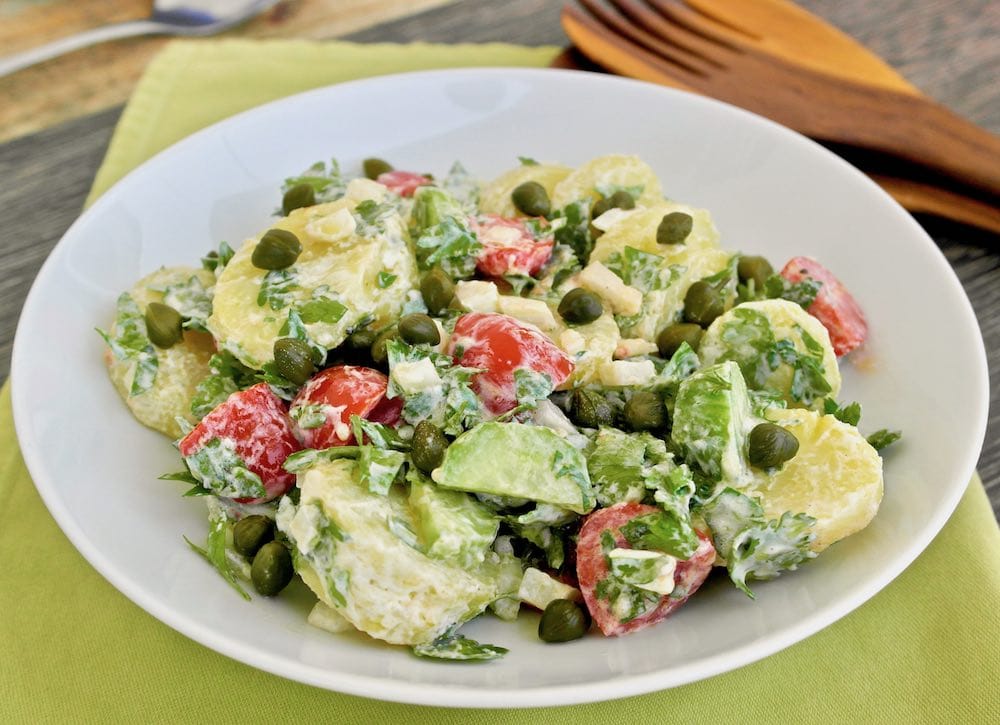This potato salad inspired by the Greek islands includes summer vegetables along with a creamy olive oil – Greek yogurt dressing