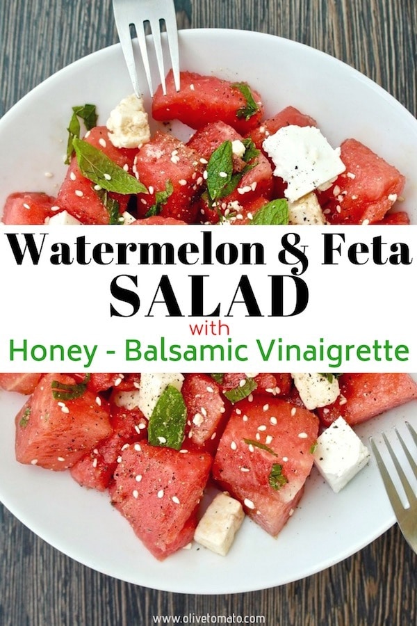 Pairing feta cheese with watermelon is a classic combination in Greece. I find that I don’t always need dressing on this salad aside from a little olive oil, but this balsamic vinaigrette is a nice change of pace! The honey in the vinaigrette really gives it something special.