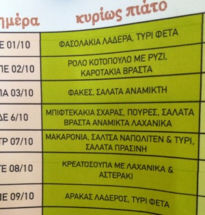 If you take a look at the school I work with (here is a menu, yes it’s all Greek to you, but I’ll do the translations). Children including pre-school and kindergarten have the following lunches throughout the week: Green Beans (Lathero) cooked with olive oil and tomato accompanied with feta cheese, Peas again cooked in olive oil along with feta, Lentils, Roasted Chicken with vegetables, Beef Patty with vegetables, Soup with beef and vegetables and Spinach pie and oh yes, they have pizza once every couple of months with just cheese and tomato.
