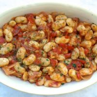 Once the beans have boiled, drain them and put them back into the pot, add the sauce and mix gently. Pour the mixture in a pan and spread evenly and then pour about another ¼ cup olive oil over the beans and bake for about 40 minutes until beans are tender.