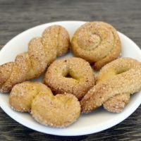 Start making your shapes. For little cookies, I take about a teaspoon of dough and roll it out in a thin cord and then make the shapes. Dip into the cinnamon-sugar mixture on both sides-place on the pan.