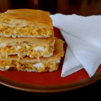 Pour the pumpkin-cheese mix, spreading evenly. Fold over the left over phyllo. Cover with 5-6 phyllo sheets again brushing each sheet with olive oil. Tuck in the leftover phyllo.